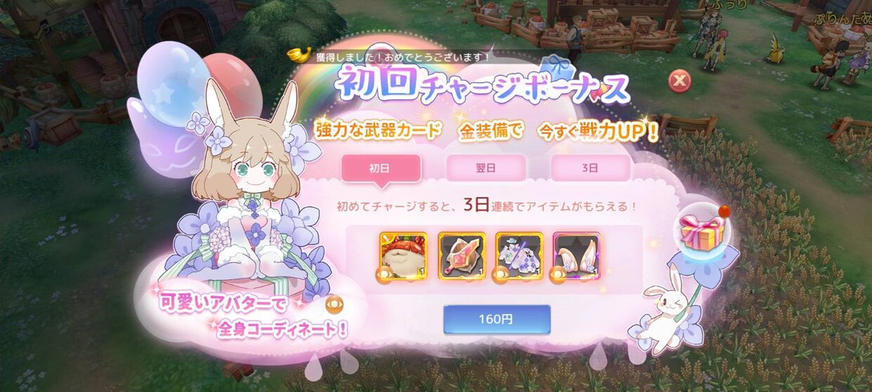 初回チャージボーナスでは、3日間連続でアイテムがもらえます。